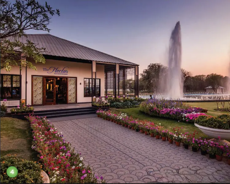 Imagine your morning: an Aroma Bath at 7am. A Nature Walk on the pedestrian paths winding through 9,000 trees. Breakfast at the Organic Café. Then the shuttle to the metro — 15 minutes to Rajiv Chowk.