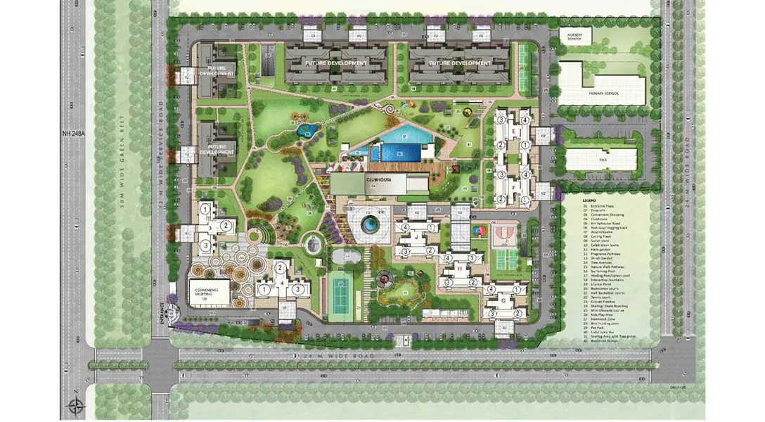 The project is positioned around wellness through its large open spaces, natural pond, Aravalli-facing environment, and fitness-oriented lifestyle planning, including a celebrity gym. The idea is to create a residential environment that supports healthier daily routines and a calmer living experience.