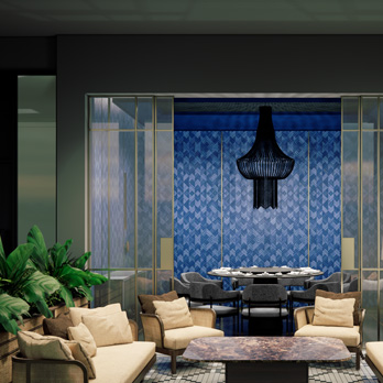 Banquet hall (capacity 500+), party lawns, sports bar, fine dining restaurant, café