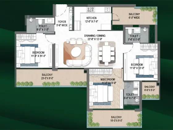 | Balcony 1 | 22'-0" × 6'-0" (Large living balcony) |