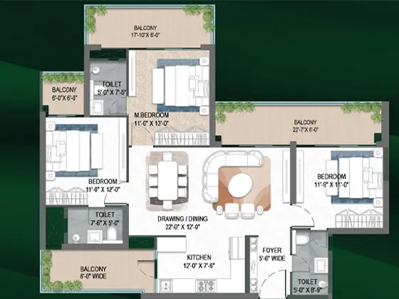 | 4 BHK | ~2,200 sq. ft. | ₹12,500/sq.ft | ₹2.75 Cr* |