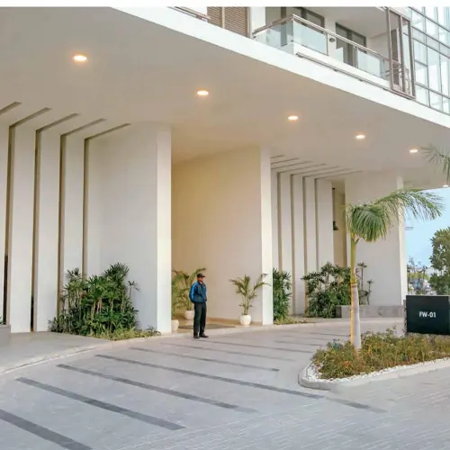The entrance is marked by stainless steel pillar edifices and premium Satvario stone framework, setting a tone of permanence and sophistication.