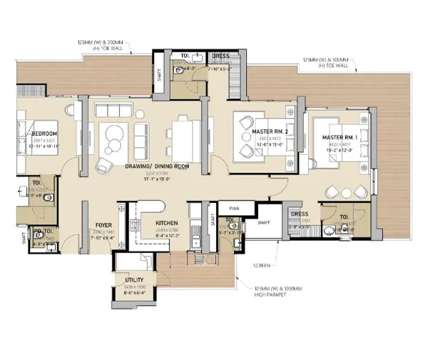 | 3 BHK Type 1 | 2,590 sq. ft. | 339 sq. ft. | ₹2.32 Cr* – ₹2.80 Cr* |