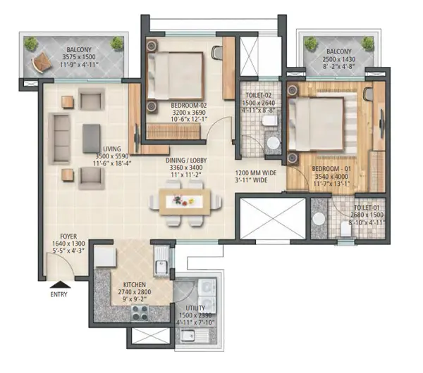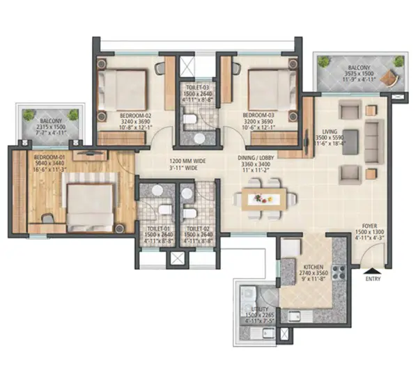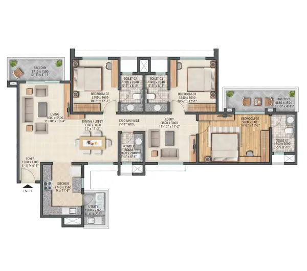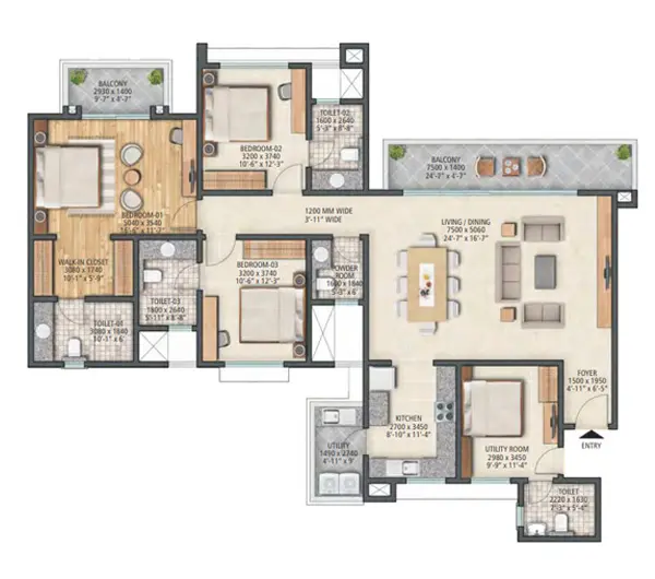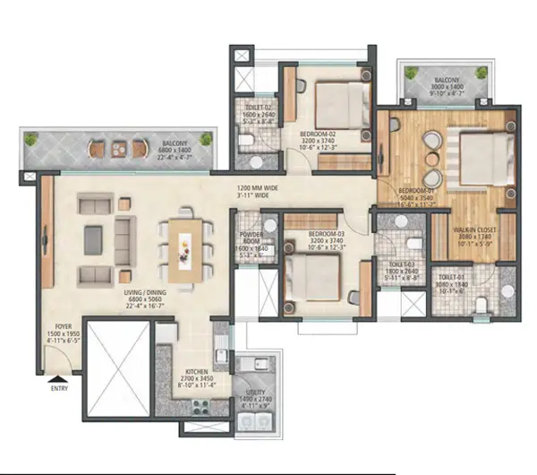 The project offers 3 BHK and 4 BHK high-rise apartments. The unit sizes are approximately 2000 to 3200 sq ft, which places them firmly in the premium and luxury segment. The larger formats are especially suitable for families who want more space, privacy, and flexibility in how the home is used.