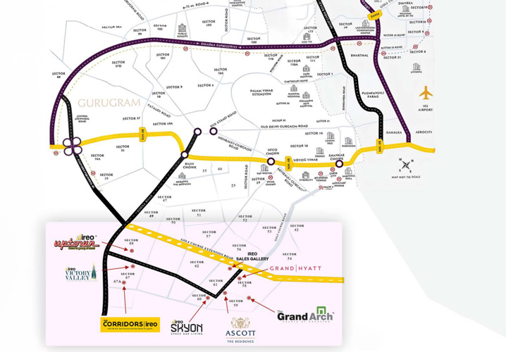Ireo The Corridors sits on Golf Course Extension Road, Sector 67A — one of Gurgaon's most sought-after residential corridors. Backed by the Sohna Elevated Road and SPR, getting anywhere in NCR is quick and stress-free.
