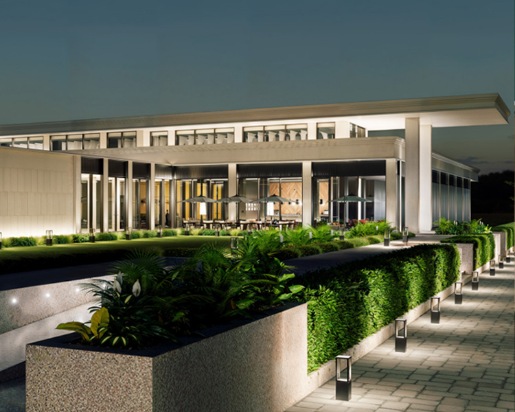 Banquet hall (capacity 500+), party lawns, sports bar, fine dining restaurant, café